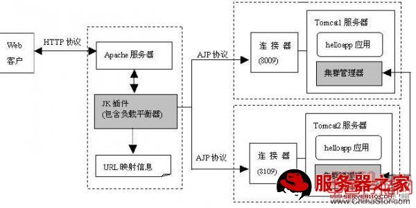 在实际应用中,如果网站的访问量很大,为了提高访问速度,可以与多个Tomcat服务器与Apache服务器集成,让他们共同运行servlet/jsp组件的任务,多个Tomcat服务器构成了一个集群(Cluster)系统,共同为客户提供服务。集群系统具有以下优点: