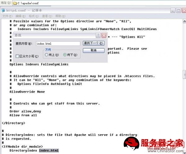 ·找到apache下conf目录,并打开httpd.conf文件,此文件是一文本文件,是apache的配置文件。