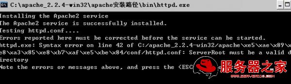 >>> httpd.exe: Syntax error on line 42 of E:/xe7xbdx91xe7xbbx9cxe5xb7xa5xe5x85xb7/apache_2.2.4-win32-x86-no_ssl/apache/conf/httpd.conf: ServerRoot must be a valid directory