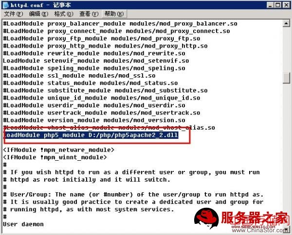 添加代码模块:LoadModule php5_module D:/php/php5apache2_2.dll 小编PHP是在D盘目录下