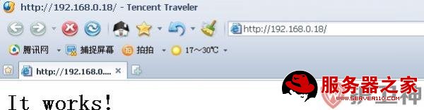 在成功开启apache服务后,在系统托盘处的图标变成绿色箭头,如图所示。在浏览器中输入自己的IP地址进行测试,当浏览器中出现It Works!时,表示apache良好,可以配置apache了。