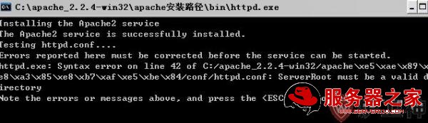 >>> httpd.exe: Syntax error on line 42 of E:/xe7xbdx91xe7xbbx9cxe5xb7xa5xe5x85xb7/apache_2.2.4-win32-x86-no_ssl/apache/conf/httpd.conf: ServerRoot must be a valid directory
