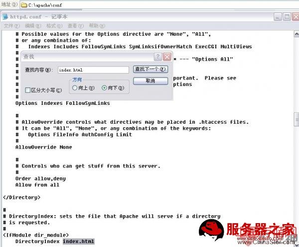 找到apache下conf目录,并打开httpd.conf文件,此文件是一文本文件,是apache的配置文件。