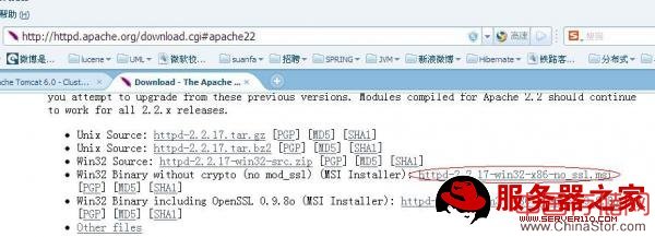 Apache是http服务器,我们利用其对Tomcat进行负载均衡。目前最新版本为2.2.17,下载地址为http://httpd.apache.org/download.cgi#apache22。如下图: