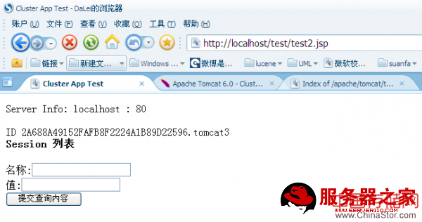 将项目部署到3个服务器,然后分别启动Apache和3个Tocmat服务器,这些Tomcat启动顺序随意,然后打开http://localhost/test/test2.jsp,