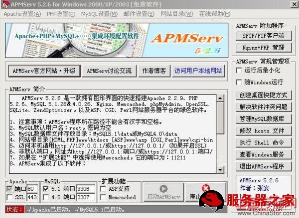 APMServ5.2.6提示:1、Apache启动失败,请检查相关配置。√MySQL5.1已启动。