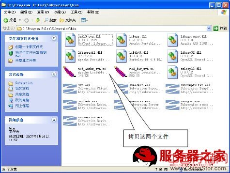 选中mod_authz_svn.so与mod_dav_svn.so两个文件,选择拷贝,进入Apache安装目录,c:Program FileApache GroupApache2mudules,将拷贝的文件黏贴到这里。回到Apache安装目录的conf目录下, c:Program FileApache GroupApache2conf,文本编辑器打开httpd.conf文件,这个文件是Apache的配置文件,非常重要。找到下面这两行: