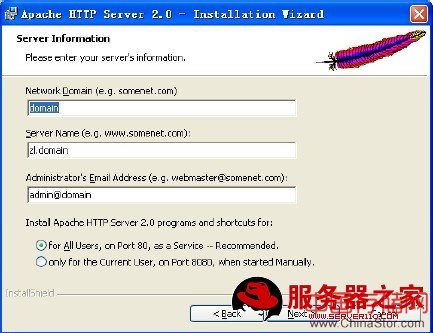 安装过程中出现上述界面需要大家输入一些信息,实际上输入任何信息都可以,并且下面的单选请选择第一个,这样Apache占用了80端口,并被安装为系统服务,如果读者机器上有其他应用占用了80端口,比如IIS,请将其换为其他端口。安装完毕后我们会发现状态栏右边已经出现Apache的图标。在浏览器输入:http://localhost