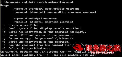可以看到,系统已经认出来该命令了。OK,下面让我们开始登录信息的创建我们可以参照htpasswd的命令选项来决定我们创建用户的命令。在前面的配置中,我们知道我们将把存放用户名与密码的文件放在E:/passwd,即e盘目录下。在命令行输入: