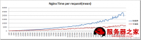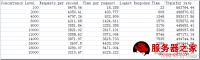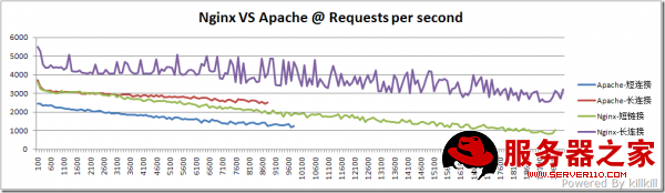 Apache 的结果图形和nginx类似,但是大家请留意横坐标,最大是10000,而nginx最大的是20000,这是由于测到10000的时候,再往上加压力Apache就受不了,不是SWAP用尽就是连接超时。