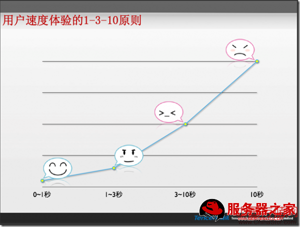 随着压力的增加,响应时间的飙升是可以预见的,但是多少才算是一个可接受范围呢?在2009系统架构师大会腾讯的邱跃鹏在《海量SNS网站的柔性运营》中的发言提到的“用户速度体验的1-3-10原则”: