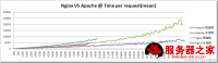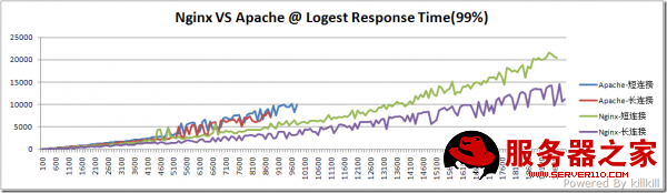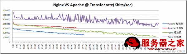 从图表可以看到nginx作单纯的WEB服务器,也就是放静态内容,性能上比Apache要好,特别可承受压力、带宽及资源消耗上都要优于Apache。很多大型网站都喜欢把nginx放在前端,可能就是这个原因吧。