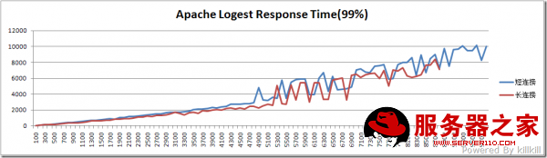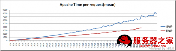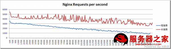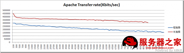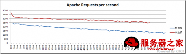 长连接的典型代表是 HTTP 1.1 ,而短连接的典型代表是 HTTP 1.0,支持HTTP 1.1的浏览器早就遍地都是了,为什么还要测试短连接呢?第一,这是因为实际的浏览中,一个“长”连接不可能像ab测试中的“长”连接这么长,所以短链接的测试成绩作为一个“底线”;第二,某些扫描工具用的就是短链接的方式,既然要做互联网的应用,也要“照顾”它们啊。因此,在生产环境中,真实的成绩会在红线和蓝线之间的区间,具体是怎么样呢,“这个就不能说太细了”。