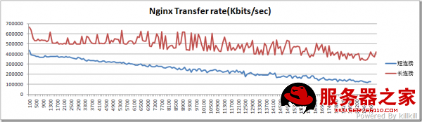 关于“传输率”这幅图的纵坐标的意义,100000 相当于 100MB/sec,也就是常说的百兆网络(忽略 CSMA/CD 造成的损失),而常说的千兆网络,经过测试,大概在400000~500000之间,换句话来说,如果nginx服务器的出口带宽是百兆网络的话,瓶颈在网络而不是nginx。