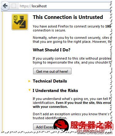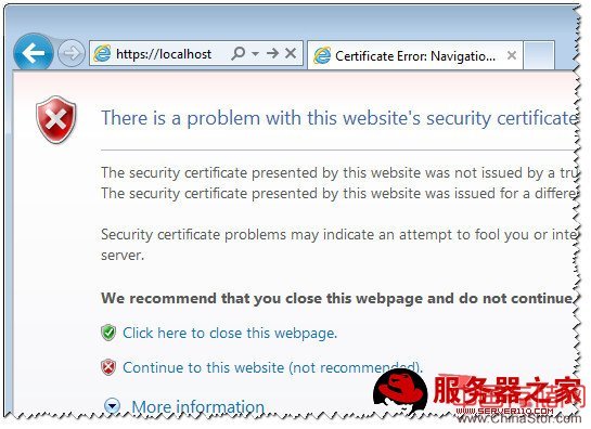 测试https://localhost/,IE会弹出security alert(安全警告),如下图: