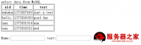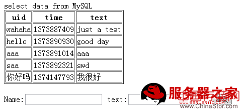 <?php $host = 'xxx.xxx.xxx.xxx'; $user = 'alan'; $passwd = 'password'; $db = 'test'; $conn = mysql_connect($host,$user,$passwd); if (!$conn) { die('Could not connect: ' . mysql_error()); } echo "select data from MySQL<br >"; mysql_select_db($db, $conn); $select_sql = "select * from login"; $result = mysql_query($select_sql); echo "<table border='1'><tr><th>uid</th><th>time</th><th>text</th></tr>"; while ($row = mysql_fetch_array($result)) { echo "<tr>"; echo "<td>".$row['uid']."</td>"; echo "<td>".$row['dt']."</td>"; echo "<td>".$row['text']."</td>"; echo "</tr>"; } echo "</table><br >"; echo "<form action='insert.php' method='post'> Name:<input type='text' name='uid' /> text:<input type='text' name='text' /> <input type='submit'></form>"; mysql_close($conn); ?> insert.php