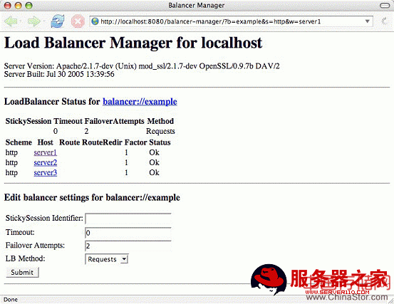 至此,整个配置全部完成,注意一点是,在各JBoss节点,重启或新增加一个JBoss节点时,需要重新启动Apache,而对于服务器群中某个JBoss节点shutdown,Apache会自动侦测,不用重新启动。