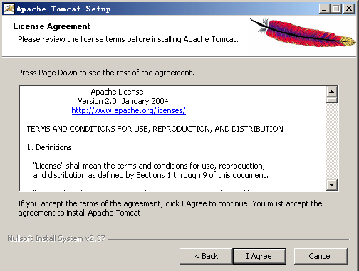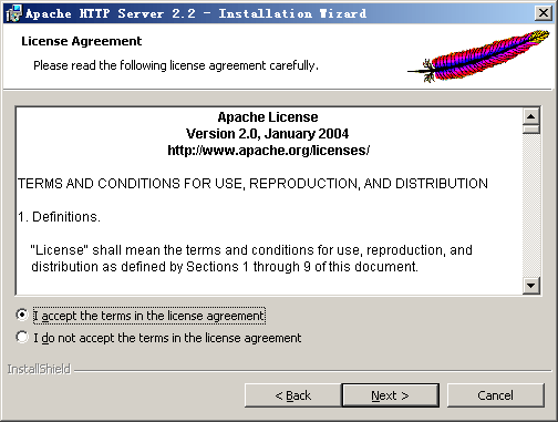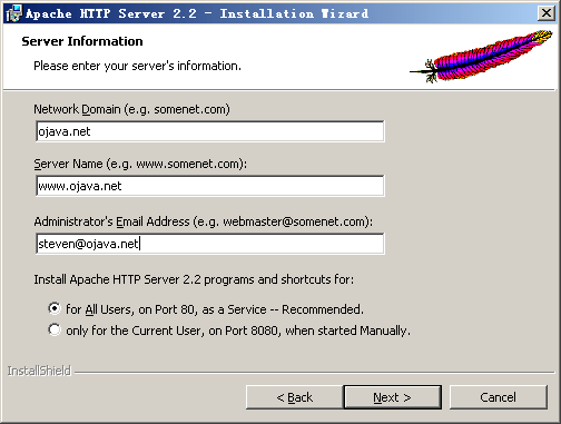 这个步骤的任务非常简单,对于windows平台,你只需要按照安装向导一步一步完成安装任务就可以了,在过程你可以会被要求填写一些信息,比如服务器的域名(你可以根据你的服务器实际的域名填写,如果你只是测试,并没有申请过域名的话,你可以随便填写一个),管理员的电子邮件等等。在这个过程中记住你的软件的安装目录,接下来的步骤中我们将会用到这个目录。我们将这个安装过程中的每一步截图记录如下: