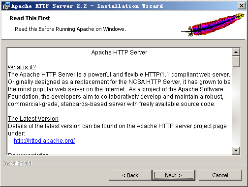 下载地址:http://httpd.apache.org,在本文编写时,httpd的服务器当前最新发行版本是2.2.11(我们称2.2版本),我们选在windows平台的二进制版本下载,我们最好选择Win32 Binary including OpenSSL 0.9.8i (MSI Installer) ,因为这个版本只是SSL,也许你将来需要提供SSL的功能,所以这里有备无患。