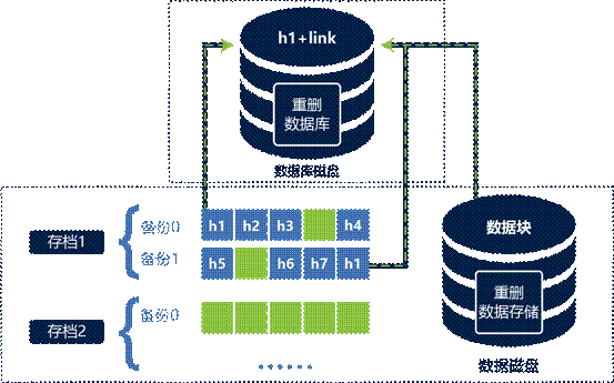 该图显示了两个备份存档。每个都有单独的一组备份。在档案1中,h1到h7(由蓝色块指定)包含存储在备份文件中的哈希值。绿色块是无法重复数据删除的数据块。存档2仅包含数据(绿色)块,并且已加密。重复数据删除数据库:包含可以进行重删数据块的哈希值,重复数据删除数据存储:包含来自存档1和存档2的数据块。
