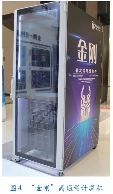 2018年10月,中国科学院计算技术研究所联合北京中科睿芯科技有限公司在中国计算机大会(CNCC)上发布了首台高通量计算机系统——“金刚”(图4),该系统集成了该所相关团队在高通量处理器、高通量系统、高通量软件及应用等领域的一系列创新技术,以高吞吐、高利用率、低延迟的特性满足数据中心基础设施建设的新需求,在高并发音视频处理、深度学习等典型应用场景相比传统服务器获得数量级的能效提升。目前,随着高通量计算机系统的成功研制,高通量计算技术将逐步应用到国民经济主战场,贡献于国计民生。
