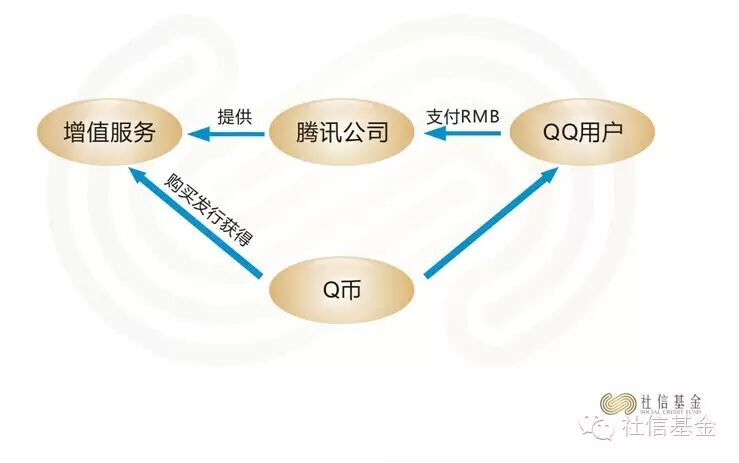 在这个市场中,Q币的流通使用过程与代金券类似,Q币最终的功能是支付腾讯公司内部的增值服务,在整个交易过程中,Q币始终是在腾讯公司内部流通,是一个闭环系统,不存在外部的影响。