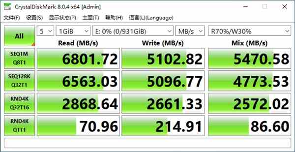 按照英睿达官方给出的性能指标,英睿达P5 Plus 1T固态硬盘的顺序读取速度为6600 MB/s,顺序写入速度为5000 MB/s;而根据我们利用CrystalDiskMark软件实测得知,英睿达P5 Plus 1T实测顺序读取速度为6800 MB/s,实测顺充写入速度为 5100 MB/s,看来英睿达官方此款固态硬盘的标称速度还是较为保守了,实际上的必能表现明显更高。从这样的性能表现来看,英睿达P5 Plus绝对称得上GEN4旗舰固态硬盘的一线水平。