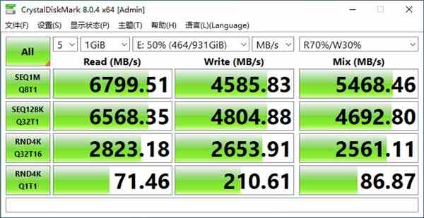 CrystalDiskMark性能测试我们通过之前的空盘以及半盘两个状态来进行一下对比,在同为1GiB数据量级的测试中,空盘与半盘的读取差异相当小,英睿达P5 Plus固态硬盘空盘时为6801.72MB/s,半盘为6799.51MB/s,差异相当的小。而写入性能差距则稍有偏大,空盘为5102.82MB/s,半盘为4585.83MB/s,相差差值为517MB/s,可看出即使是固态硬盘占用情况达到一半,英睿达P5 Plus的性能表现仍是相当的优异。