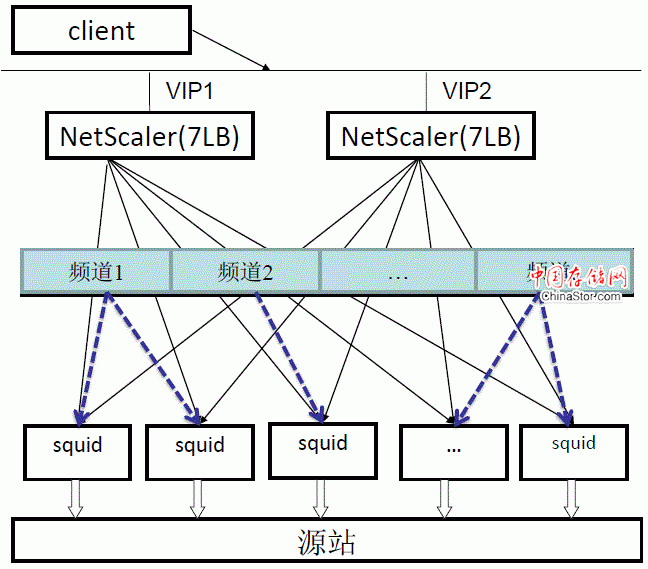 •流量分布均匀性:所有的频道统一调度到128台squid,而不是将squid按频道分组,可提高命中率2%以上