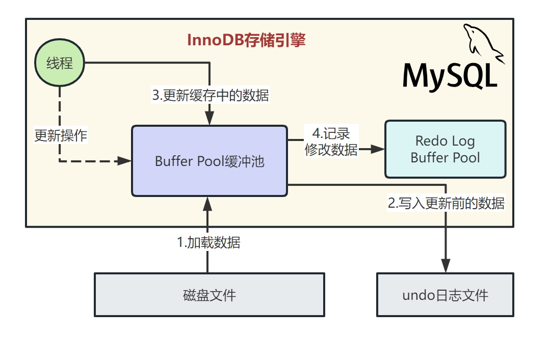 MySQL有一个后台的IO线程,会在之后某个时间里,随机的把内存buffer pool中的修改后的脏数据给刷回到磁盘上的数据文件里去,我们看下图: