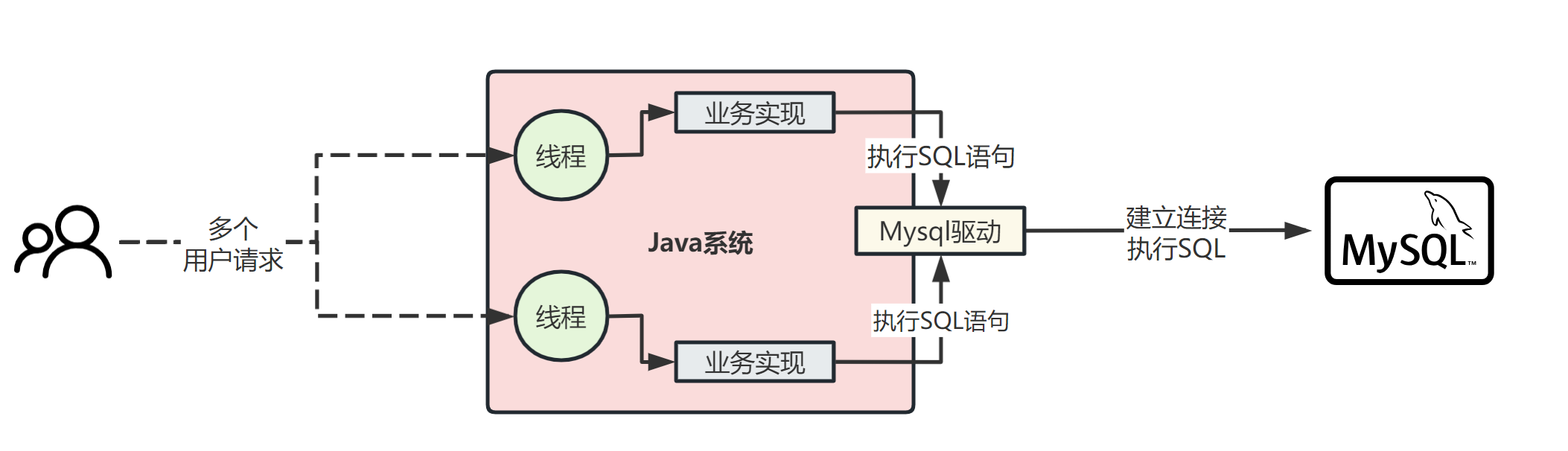 因此,当有多个业务请求的时候,每一个请求我们可以单独建立一个数据库连接进行单独使用,如下:
