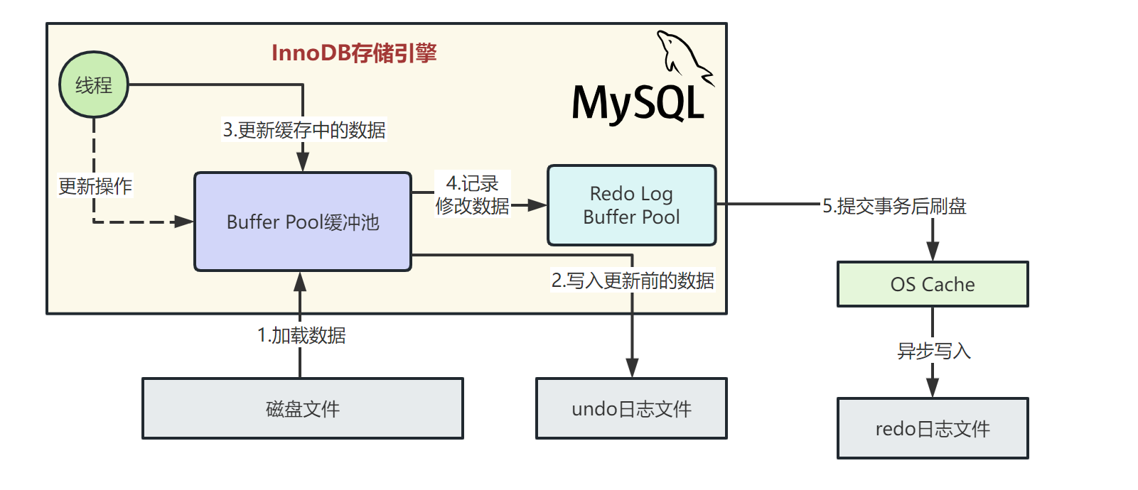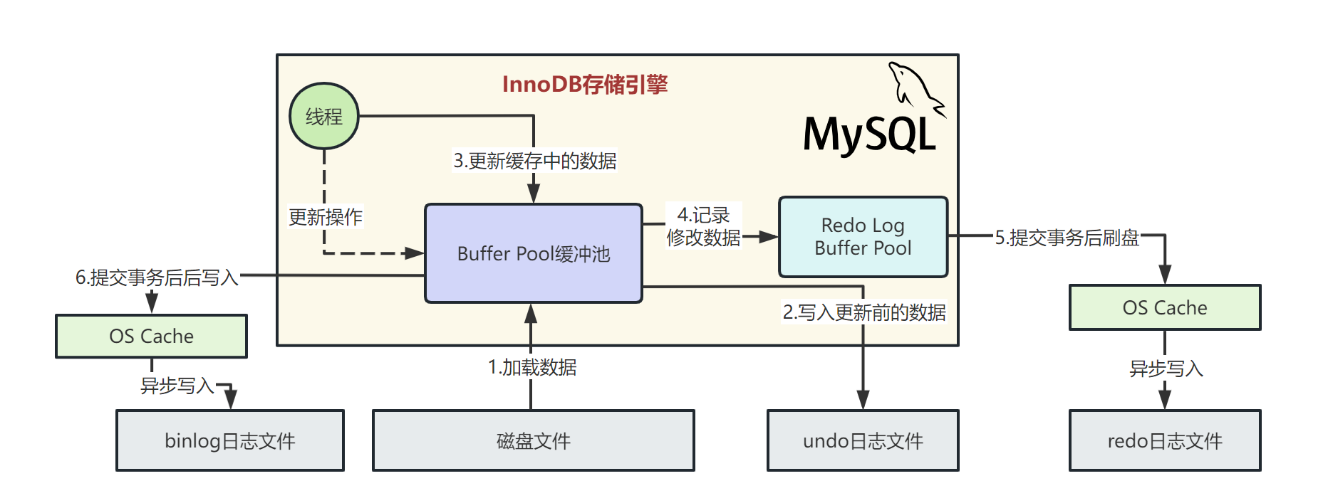 在你执行更新的时候,每条SQL语句,都会对应修改buffer pool里的缓存数据、写undo日志、写redo log buffer几个步骤;但是当你提交事务的时候,一定会把redo log刷入磁盘,binlog刷入磁盘,完成redo log中的事务commit标记;最后后台的IO线程会随机的把buffer pool里的脏数据刷入磁盘里去。
