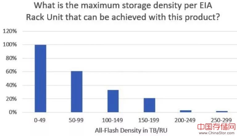 根据DCIG的统计情况,全闪存阵列产品的存储密度也在显著增加,有一半产品的存储密度已经超过了50TB/RU(Rack Unit,机架单元),甚至有一些产品的存储密度达到了惊人的200TB/RU。