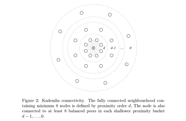 Kademlia假设每个节点都分配了一个与其网络地址不同的Swarm地址。通过计算前缀位(prefix bits)的数值中两个Swarm地址的共同值,我们可以定义它们的接近度。彼此最接近的节点们将形成一个完全连通的邻域(neighbourhood)。此外,每个节点连接到来自每个离散邻近类(discrete proximity class)的多个对等节点(见图2)。