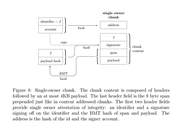 单一所有者块的地址通过所有者地址和一个identifier进行哈希计算而得。单一所有者块数据的完整性由所有者的加密签名来保证,该签名证明任意块的数据与identifier之间的关联(见图8)。换句话说,每个identity都拥有Swarm地址空间的一部分,他们可以在其中自由地将内容分配给一个地址。