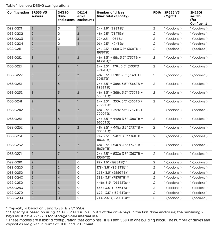 Lenovo DSS-G 的配置如下表所示。每个配置都安装在一个 42U 机架中,但多个 DSS-G 配置可以共享同一个机架。