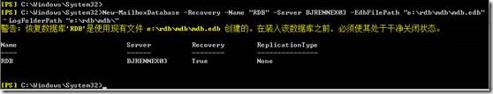 New-MailboxDatabase -Recovery -Name "RDB" -Server BJRENNEX03 -EdbFilePath "e:rdbmdbmdb.edb"