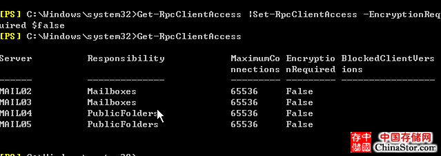 8. 默认来说,由于Exchange 2010 采用了加密的连接来实现安全的连接,这样的话如果使用的默认的outlook 2003 则无法实现正常的连接,我们可以通过以下命令了解是否处于加密状态: