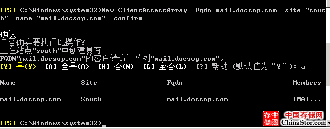 New-clientaccessarray –fqdn mail.docsop.com –site “southchina” –name “mail.docsop.com”-confirm
