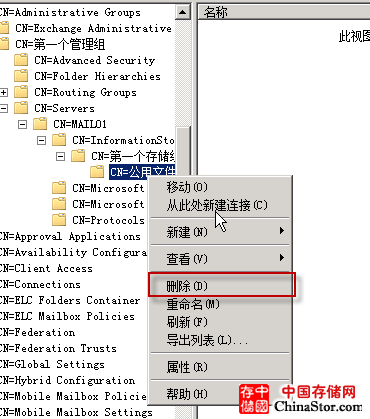 2. 我们先删除邮箱存储数据库,直接在存储数据库点击右键-删除: