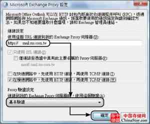 點選後將開啟如下圖所示的頁面,在此輸入公司Exchange Server 2010對外開放連線的網址,這部分與OWA網址相同,但是不加「/OWA」路徑。接著將「Proxy驗證設定」下拉選單的選項設定為【基本驗證】即可。(更多精彩文章詳見網管人第61期﹚
