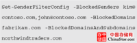 接著,開始設定所要封鎖的寄件者。如圖7所示,在此範例中先執行以下的命令參數來封鎖特定的兩個外部寄件者,以及封鎖一個特定的外部網域與一個特定的外部網域並包含其子網域。