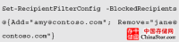 一旦啟用收件者封鎖清單功能後,便可以如圖10範例下達命令「Set-RecipientFilterConfig -BlockedRecipients jovi@contoso.com,sandy@contoso.com」來設定封鎖的收件者清單。若想同時進行新增與移除特定清單項目的動作,則可下達類似這樣的範例: