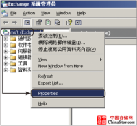 先開啟「Exchange系統管理員」介面,然後如圖6所示針對最上層的項目節點按一下滑鼠右鍵,然後點選快速選單中的【Properties】。