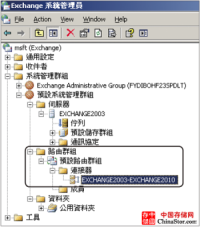 安裝好Exchange Server 2010之後,開啟Exchange Server 2003主機上的「Exchange系統管理員」設定視窗,如圖16所示依序點選至「路由群組」→「預設路由群組」→「連接器」節點,展開後,就能看到系統自動建立的「EXCHANGE2003-EXCHANGE2010」連接器項目。