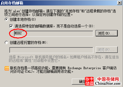 2) 在“启用存档邮箱”对话框中,选择“创建本地存档”,然后指定存档邮箱的数据 库为“MDB2”。(建议选择存储空间大的邮箱数据库作为存档邮箱的数据库,这里特意选择MDB2,用户邮箱数据库为MDB1。)