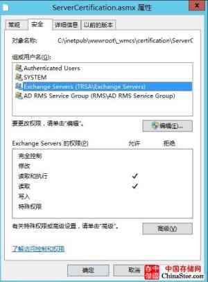 2. 添加活动目录中的Exchange Servers、AD RMS Service Group组,并设置为允许“读取”和“读取及运行”