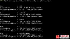 4、验证是否对现有邮箱成功启用了内部部署,输入以下命令Get-Mailbox | FL Name,Archive*Quota