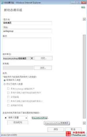 2、在弹出的新建通讯组框内,显示名处填写“森泰集团”,别名填写“santegroup”,组织单位选择AD内的组织单位森泰集团,添加规则,收件人容器,选择到AD内的组织单位森泰集团。在点击保存,完成动态通讯组的新建。
