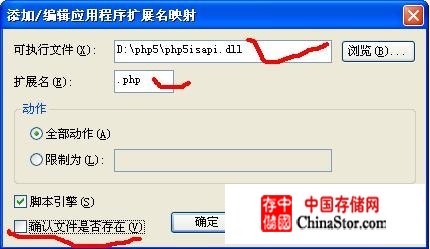 输入phpisapi.dll文件的路径,注意有些php网站需要把“确认文件是否存在”这个选项去掉的,扩展名写.php: